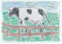 芽衣ちゃんの家で、牛舎の中に入り牛の乳をしぼらせてもらった。牛は何回か、見たことはあったけど乳しぼりは初めて。すごく大きい。ビックリしたことは、牛がしっぽを上げると「うんこする」ということ。私は、そのうんこをする瞬間を見て、「うわー本当なんだー」と思った。 |