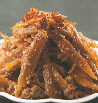 フライパンにサラダ油と赤唐辛子を入れ、ひき肉を炒め、 火が通ったらごぼうを加えて炒め、水気をとばす。 |